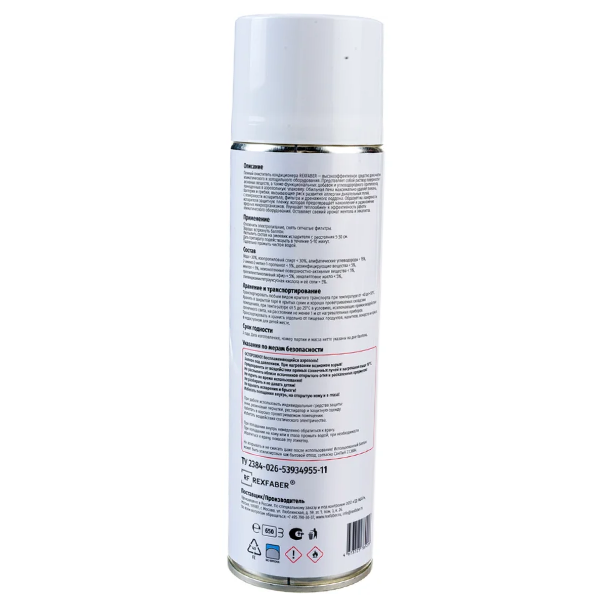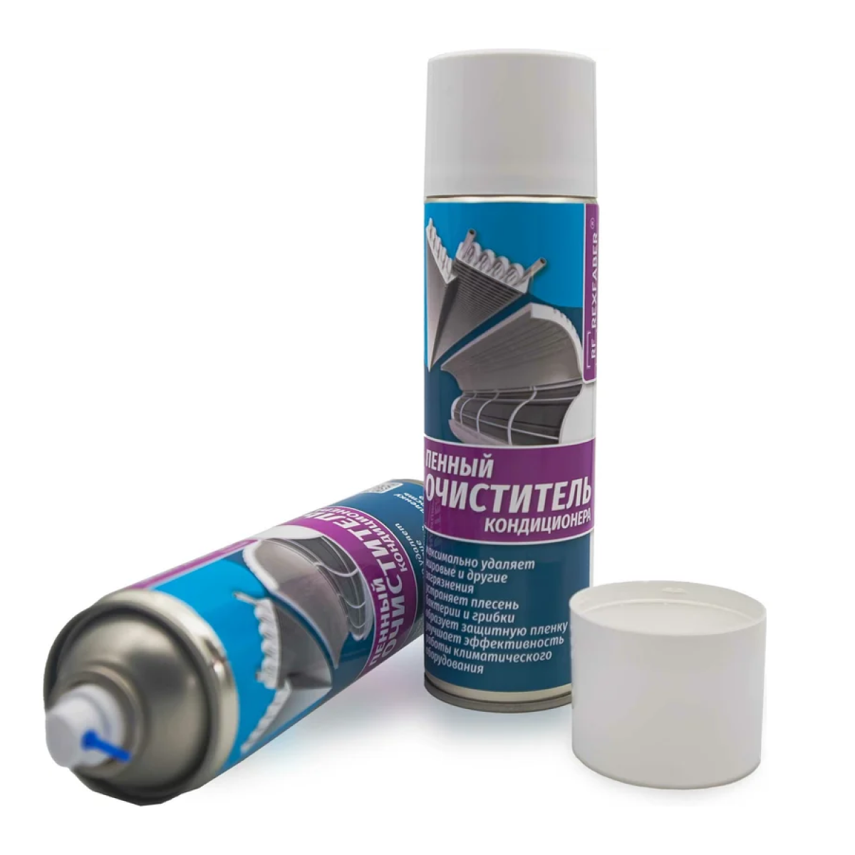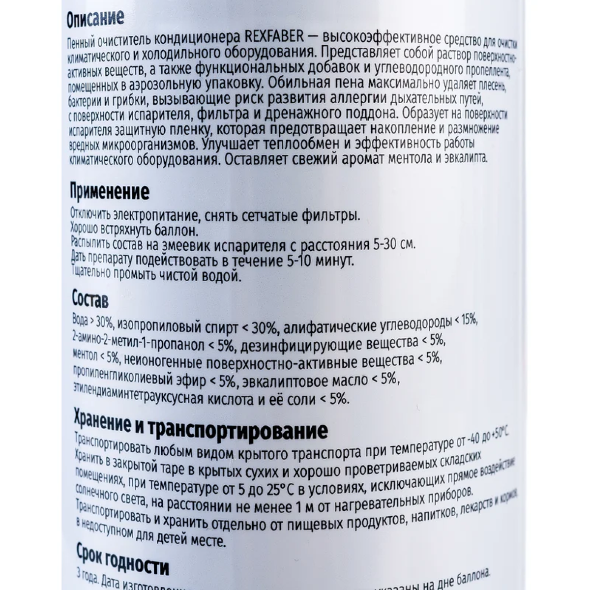 Пенный очиститель кондиционера REXFABER — средство для очистки климатического и холодильного оборудования. Раствор поверхностно-активных веществ и функциональных добавок, углеводородного пропеллента помещен в аэрозольную упаковку. Оставляет свежий аромат ментола и эвкалипта после применения.