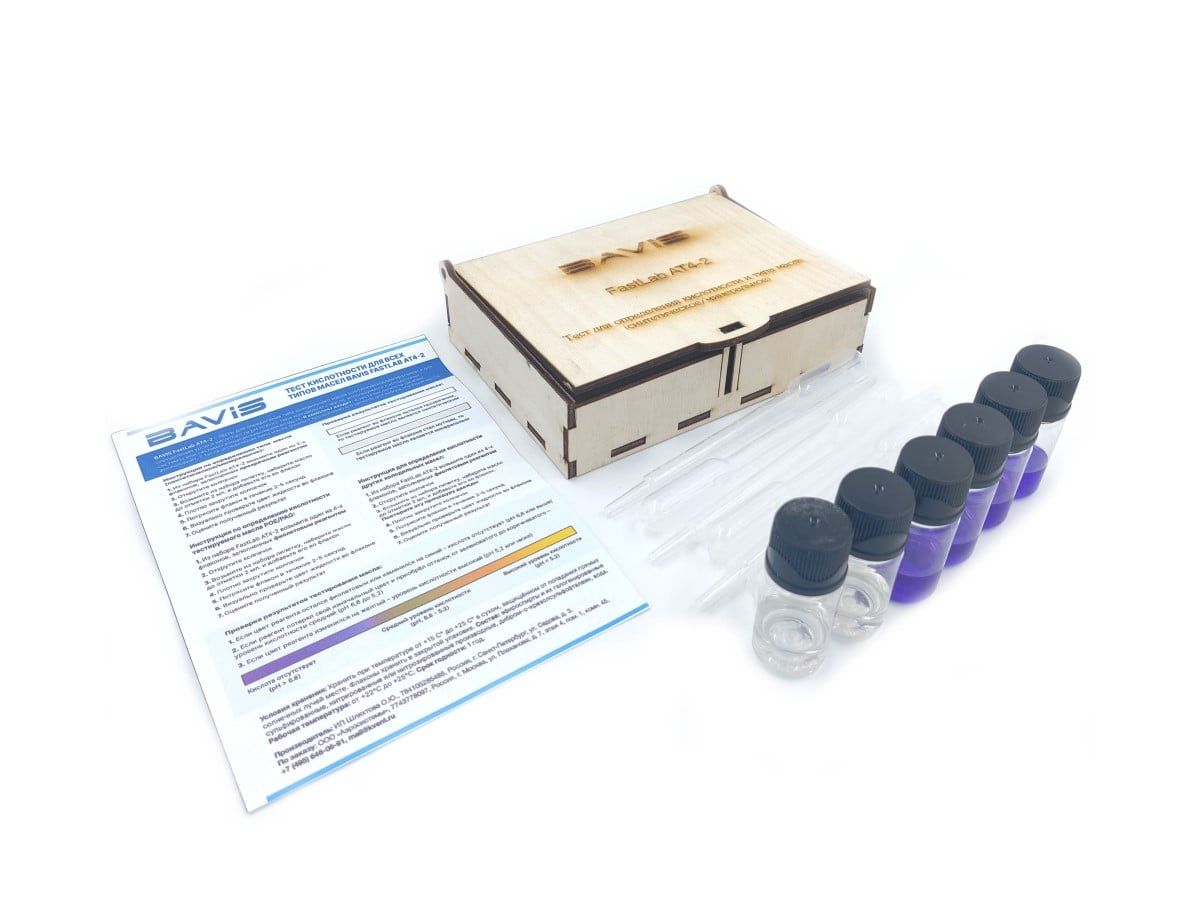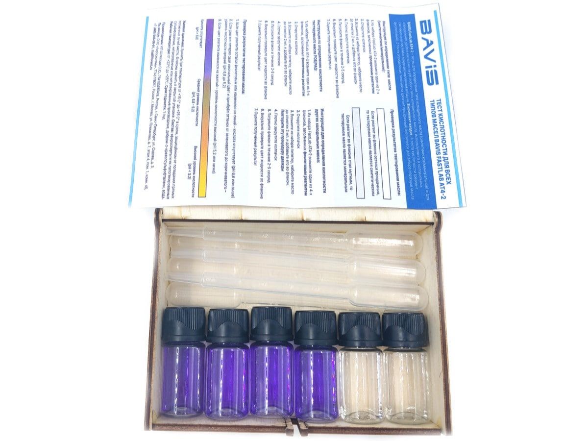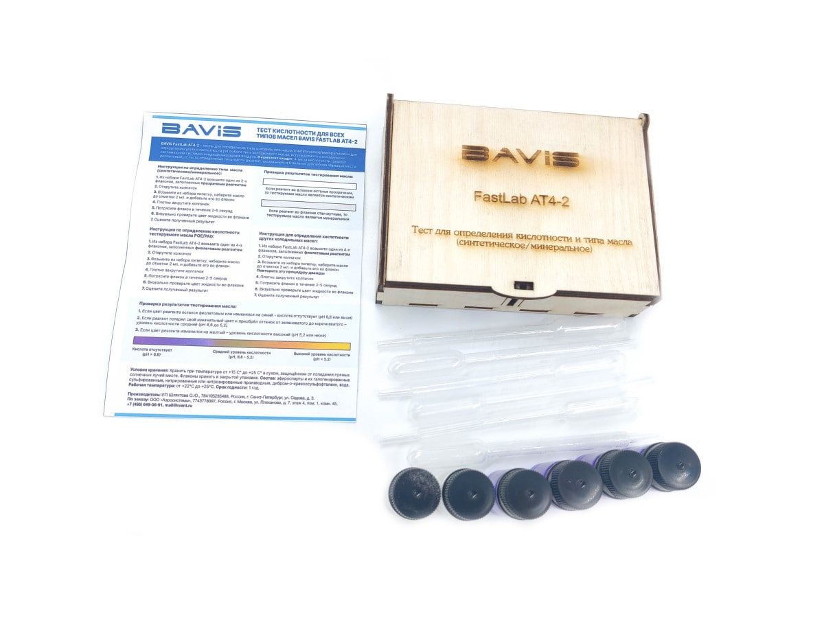 Тест кислотности для всех типов масел BAVIS FastLab AT4-2 предназначен для определения типа и кислотности уровня pH холодильного масла. Комплект состоит из 6 тестов с пипетками для взятия масла на образец. Четыре теста определяют уровень pH (цвет реагента - фиолетовый) и два теста определяют тип масла (синтетическое/минеральное).