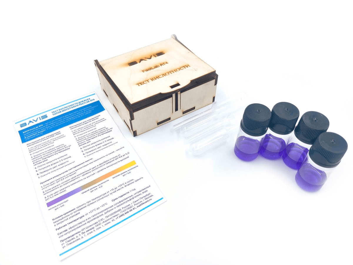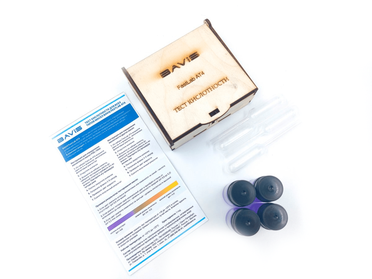Тест кислотности для всех типов масел BAVIS FastLab AТ4 предназначен для определения типа и кислотности уровня pH холодильного масла. В комплект входят 4 теста, определяющие номинальный уровень pH (Цвет реагента - фиолетовый) и 4 пипетки в деревянной коробке для хранения.