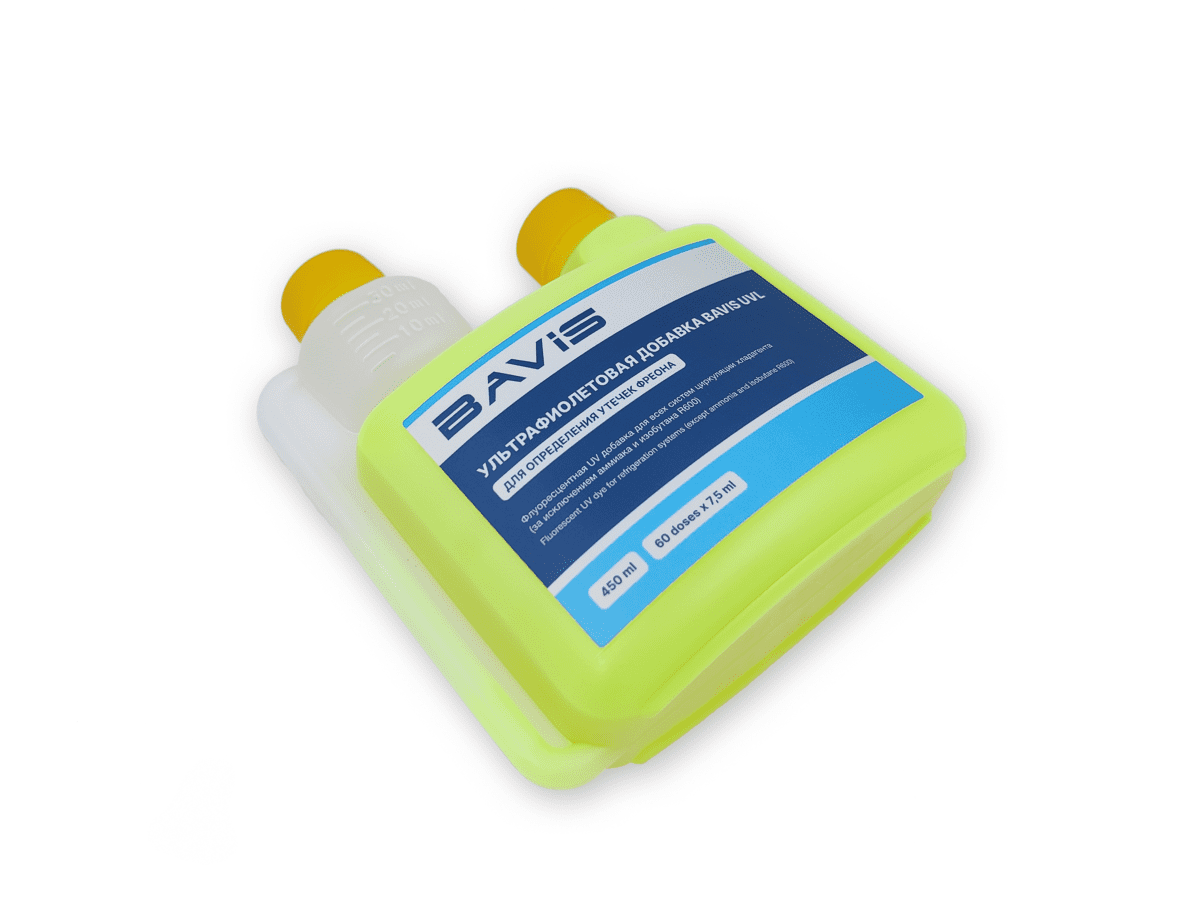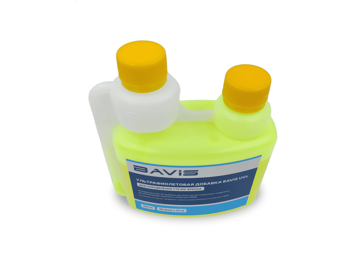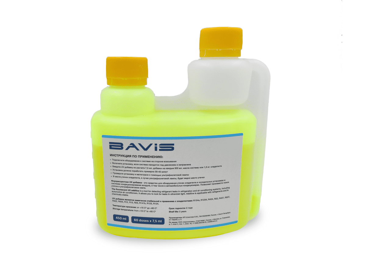 BAVIS UVL – профессиональная ультрафиолетовая добавка для четкого выявления утечек хладагента в ультрафиолетовом свете. Химически стабильна. Объем: 450 мл (60 доз по 7.5 мм).