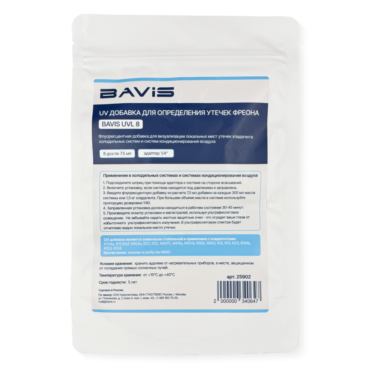 BAVIS UVL 8 – профессиональная ультрафиолетовая добавка для четкого выявления утечек хладагента в ультрафиолетовом свете. Применима с хладагентами CFC, HCFC и HFC. Объем: 8 доз по 7.5 мм.