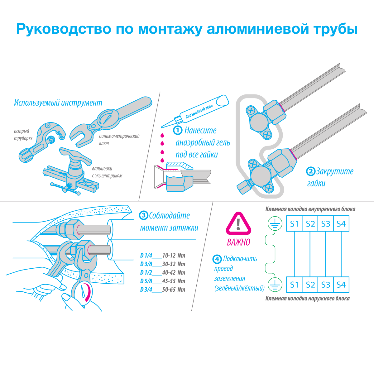 При использовании алюминиевых труб для монтажа кондиционеров, нужно обязательно соединять проводом колодки заземления между внутренним и внешним блоком кондиционера.