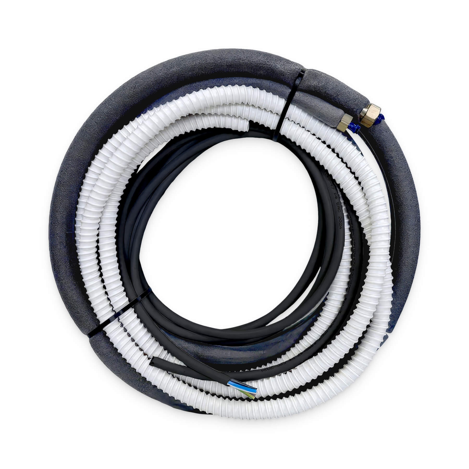 Готовая межблочная трасса для самостоятельного монтажа кондиционера/сплит-системы мощностью от 5 кВт до 8 кВт. Состоит из готовых медных трубок 1/4" и 1/2" в теплоизоляции с развальцованными концами для герметичного соединения блоков кондиционера, дренажного шланга 5/8" для отвода конденсата от внутреннего блока, межблочного кабеля ВВГнг 4х1.5.