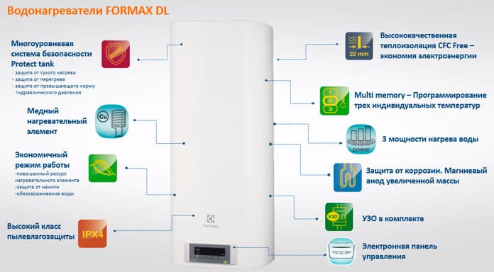 Electrolux EWH Formax DL - электрический накопительный водонагреватель с эмалированным покрытием бака в прямоугольном дизайне. Одним из главных преимуществ данной модели является функция Multy memmory, которая позволяет программировать до трех индивидуальных температур нагрева.