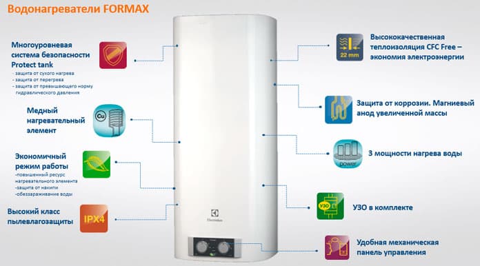 EWH Formax он комплектуется Устройством Защитного Отключения. Внутри водонагревателя