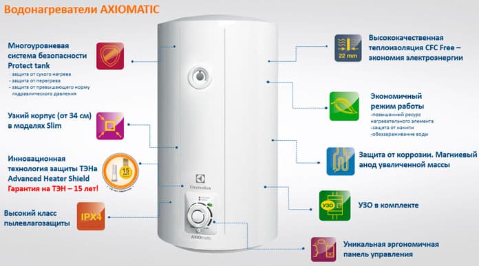 Electrolux EWH AXIOmatic - электрический накопительный водонагреватель узкого диаметра (34 см) выгодно отличается эффектным, запоминающимся дизайном, высокой функциональностью и передовыми технологиями. Внутренний бак водонагревателя изготовлен из высококачественной стали с мелкодисперсным эмалевым покрытием.
