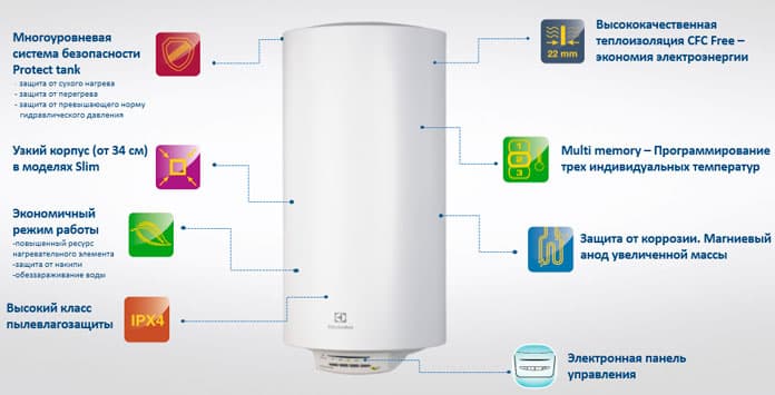 EWH Heatronic DL Slim установлен специальный термостат, который срабатывает при нагреве воды в баке до показателя 85°С, что обеспечивает защиту прибора от перегрева.