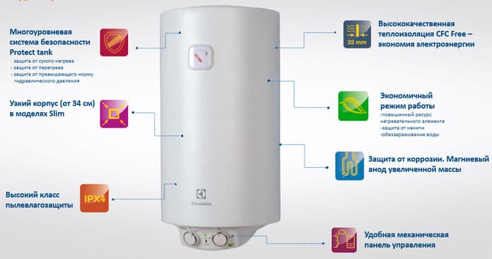 Электрический накопительный водонагреватель Electrolux EWH Heatronic Slim широко используется в городских квартирах, офисах, загородных коттеджах, на дачах и т.п. для быстрого и надежного решения вопросов горячего водоснабжения.