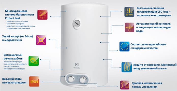 Водонагреватель оснащен предохранительным сливным клапаном, защищающим водонагреватель от избыточного давления, а также системами защиты от перегрева и сухого нагрева, предусмотрена функция экономичного режима, при активации которой температура воды в баке будет поддерживаться на уровне 55 градусов. При такой температуре проходит процесс обеззараживания воды, водонагреватель работает в экономичном режиме и защищён от накипи.